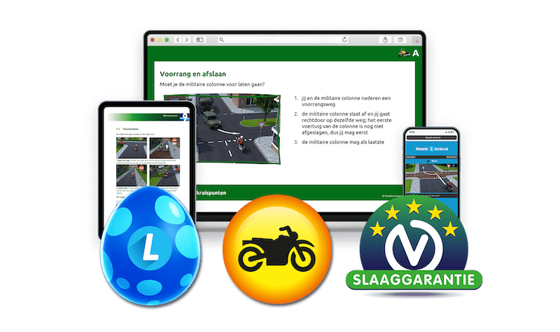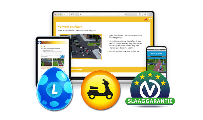 Je krijgt bovendien 24 uur per dag online toegang. Dus je kan oefenen wanneer en waar je maar wilt. Ook via je smartphone. Niet voor niets slagen elk jaar weer tienduizenden mensen voor het theorie-examen met ons lesmateriaal.